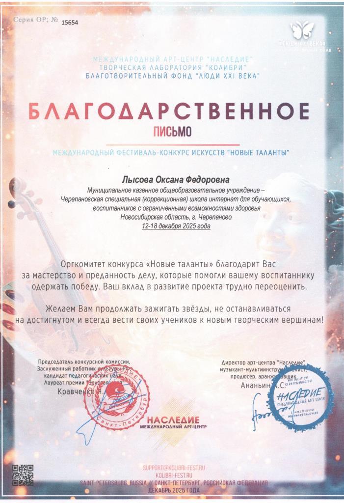 Благодарственное письмо. Международный фестиваль-конкурс искусств "Новые таланты" г.Санкт-Петербург 18.12.2025г.