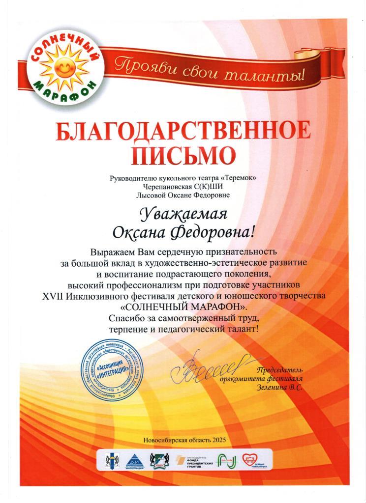 Благодарственное письмо за подготовку участников XVII Инклюзивного фестиваля детского и юношеского творчества "Солнечный марафон" 12.04.2025г.