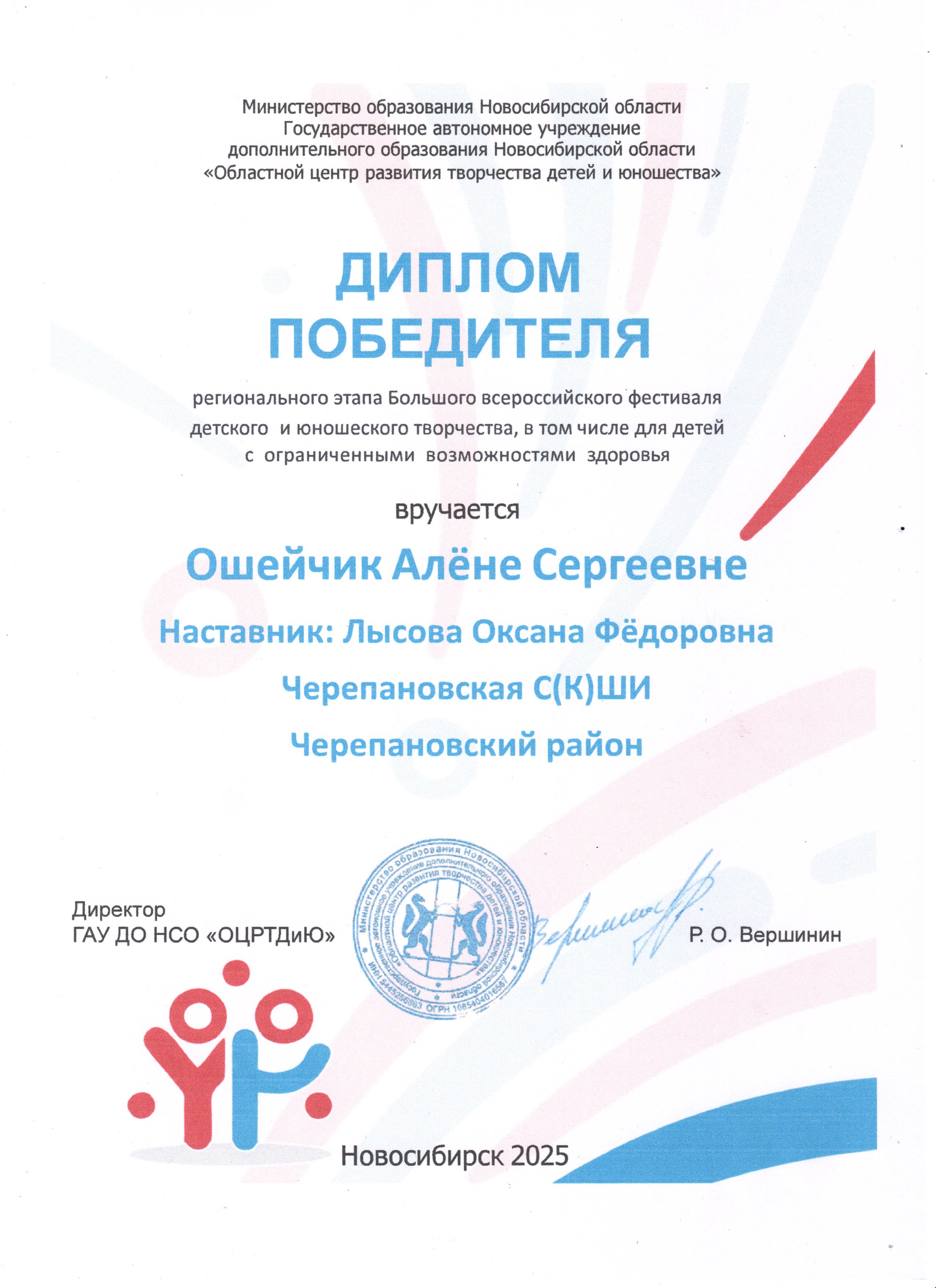 Диплом победителя регионального конкурса "Большой всероссийский фестиваль детского и юношеского творчества, в том числе детей с ОВЗ" 16.08.2025г.